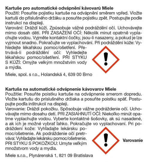 Descaling cartridge for automatic descaling of Miele coffee machines.