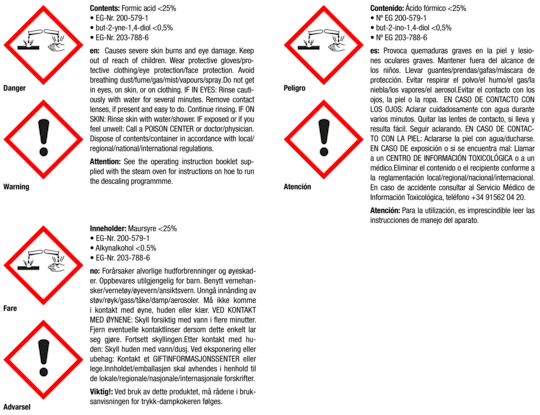 Danger. Contains Formic acid. Causes severe skin burns and eye damage. If medical advice is needed, have product container or label at hand. Keep out of reach of children. Wear protective gloves, eye protection, face protection. IF SWALLOWED: Rinse mouth. Do NOT induce vomiting. IF ON SKIN (or hair): Take off immediately all contaminated clothing. Rinse skin with water or shower. IF IN EYES: Rinse cautiously with water for several minutes. Remove contact lenses, if present and easy to do. Continue rinsing. Immediately call a POISON CENTER, a doctor. Store locked up. Dispose of contents, container to a hazardous or special waste collection point. Corrosive to the respiratory tract.