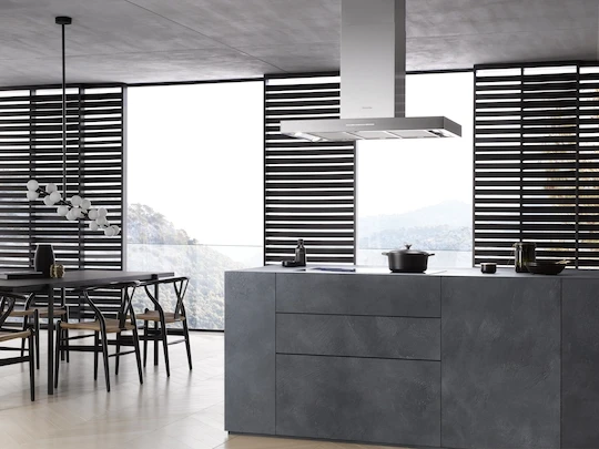 Island cooker hood with energy-efficient LED lighting and light-touch switches for easy use.