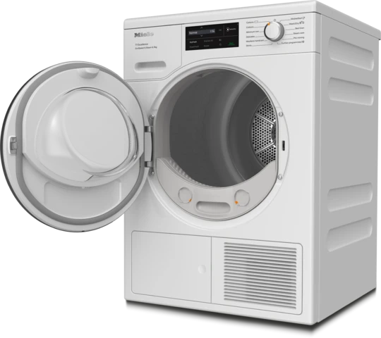 T1 heat-pump dryer: with SteamFinish, DryCare 40 and SilenceDrum for gentle drying.