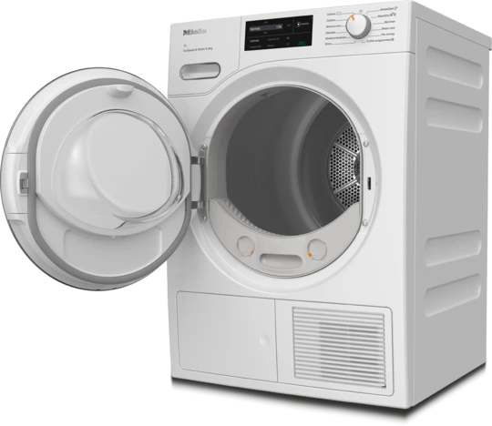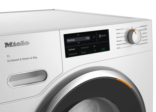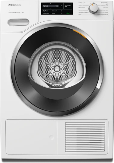 T1 heat-pump dryer: with SteamFinish, DryCare 40 and SilenceDrum for gentle drying.